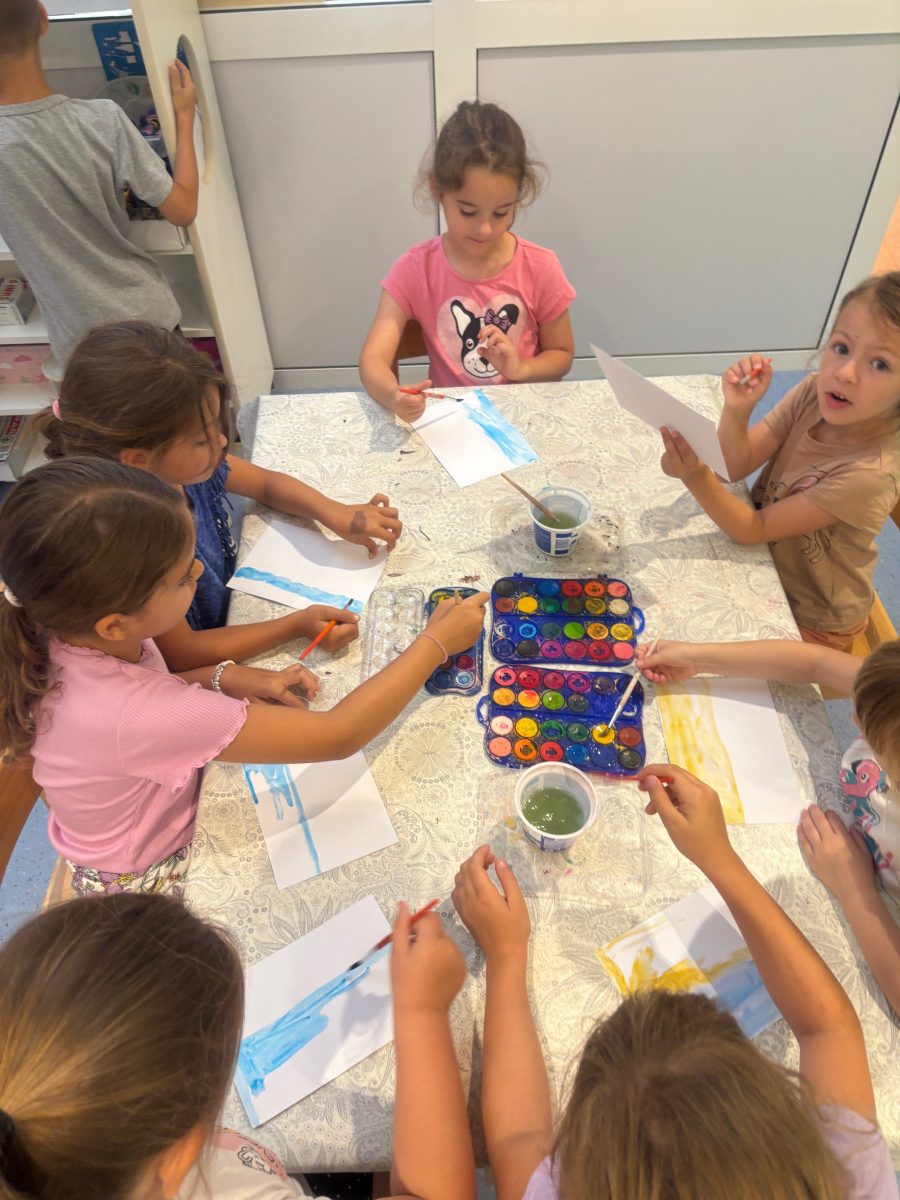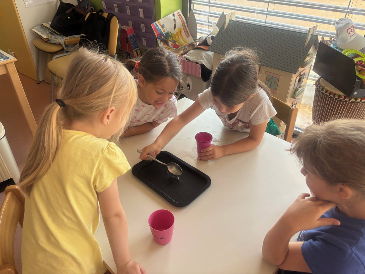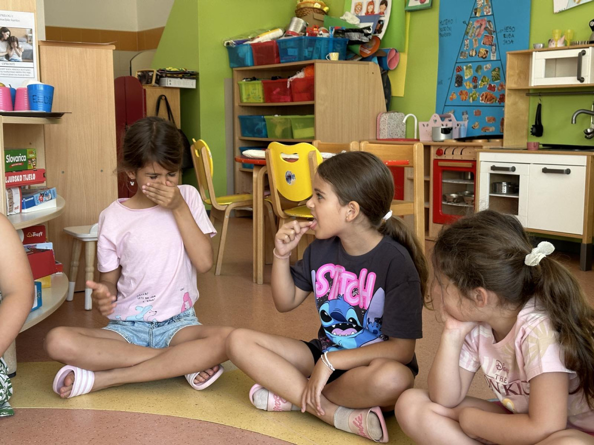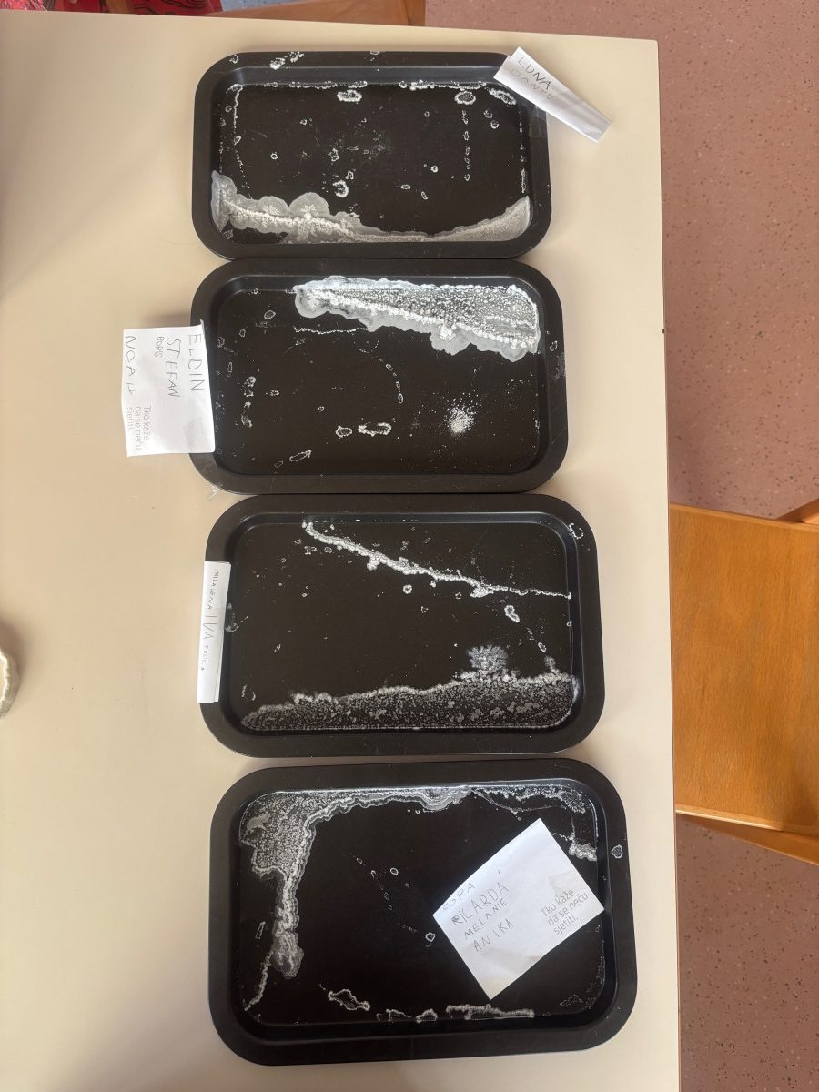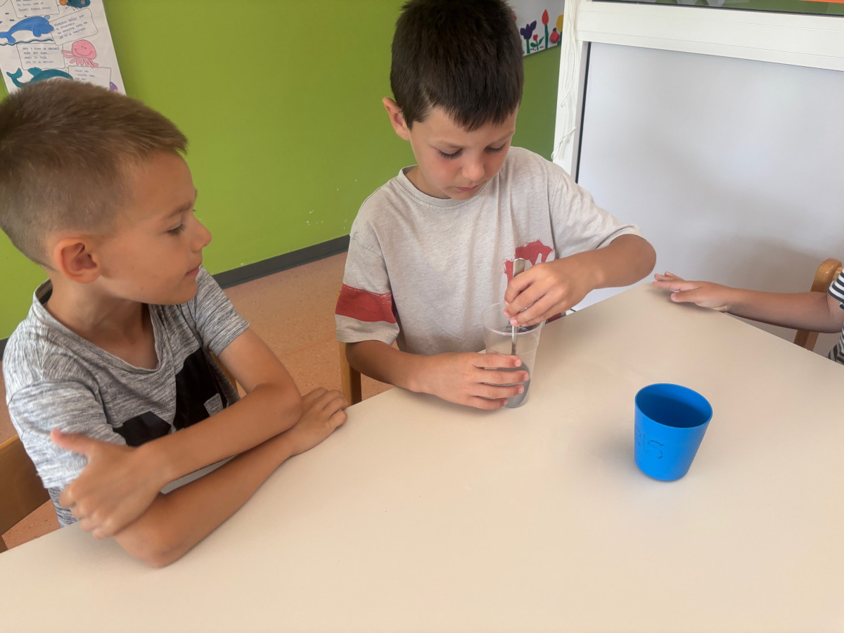U skupini su u drugom tjednu zavladale morske aktivnosti – upoznali smo se s rakom Slankom kroz slikovnicu „Slanko“ u kojoj rak priča o proizvodnji morske soli u gradu Ninu. Znatiželjni kako se sve to radi djeca su se htjela okušati u proizvodnji morske soli pa smo se upustili u zanimanje istraživača. Prvo smo kušali sol što je izazvalo smijeh i smiješna lica djece. Zatim su u manjim skupinama napravila imitaciju mora miješajući sol i vodu, izlili svoje more na pladnjeve i stavili iste na sunce kako bi ono isparilo vodu i kako bismo dobili sol. U procesu su se djeca prisjetila svega što smo naučili u istraživanju vode prije par mjeseci. Za par sat na toplom ljetnom suncu djeca su imala prilike vidjeti kristale soli koji su se nataložili na pladnjevima. Svi su bili jako veseli i pokazivali rezultate svima u vrtiću.