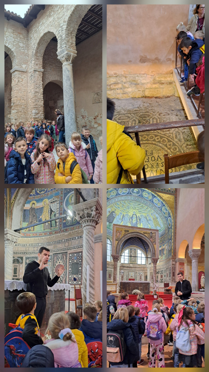 Ovogodišnji Poreč Dox ponudio je 4 kratka animirana filma, snažna porukama i osebujnošću izraza. Iako potpuno drugačiji od crtića na koje smo navikli,svidjeli su nam se pa smo pokazali da imamo i dobar filmski ukus 😀. Po povratku smo posjetili Eufrazijevu baziliku, čudili se podnim mozaicima starim više od 2000.godina i divili stropnim mozaičkim pozlatama. Upustili smo se u duhovni razgovor sa svečenikomTobiom, pokazali da znamo postavljati pitanja i davati vrlo promišljene odgovore (Zašto ne vidimo Boga?, Od čega štiti sv.Mauro Poreč?..i sl.).Svečenik je bio vrlo sretan našim posjetom i nagradio nas bombonima koje nismo mogli odbiti 😀.